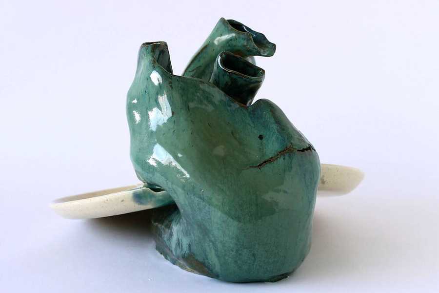 “An Imaginary Point” is an interaction of geometric and biomorphic forms inspired by a bike in a tree photo. The tree has grown around it and the bike havering in the middle of the tree trunk. I am interested in the connection between anything that has physical mass and how they affect each other. I transfer these changes into tangible forms.